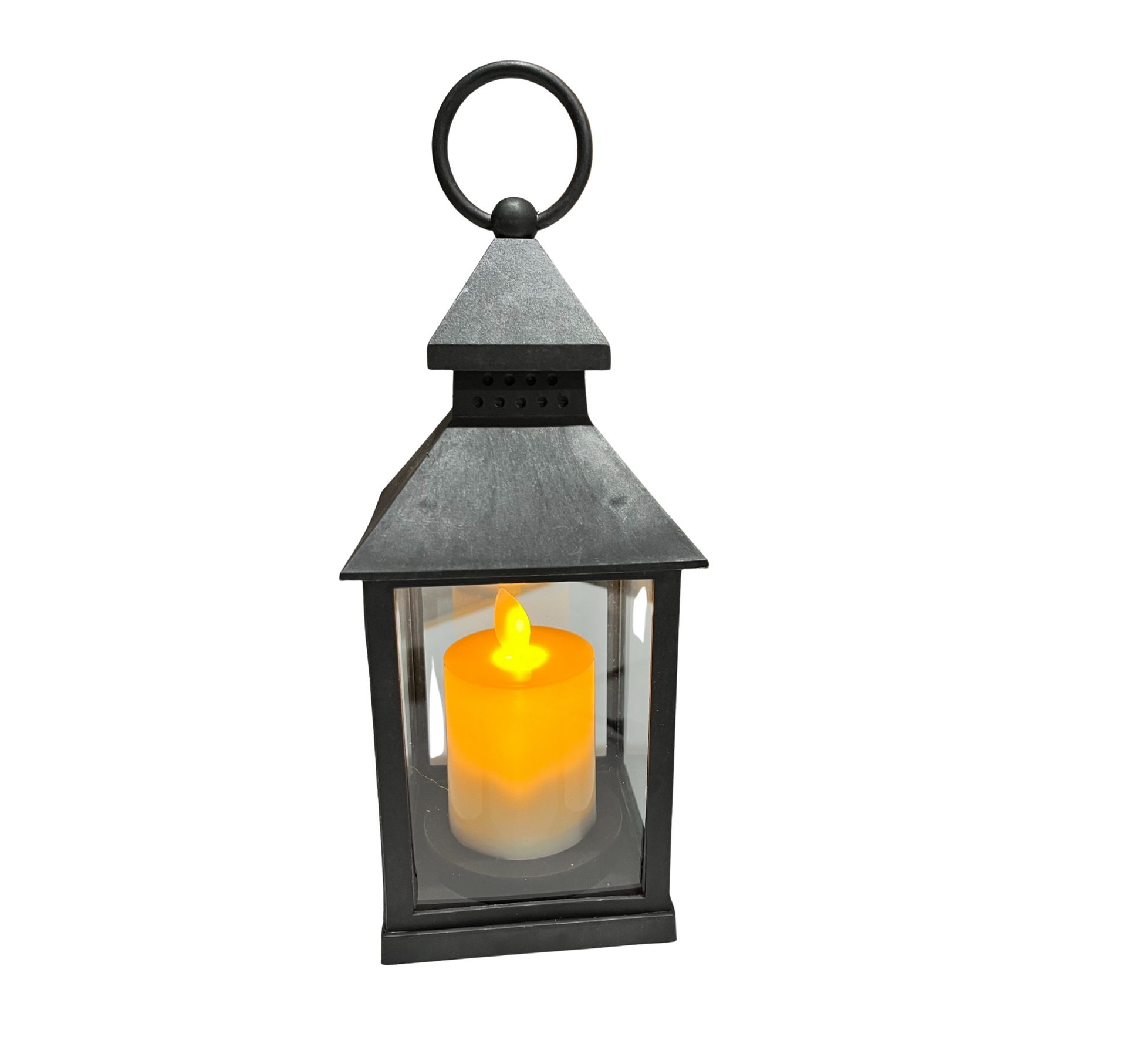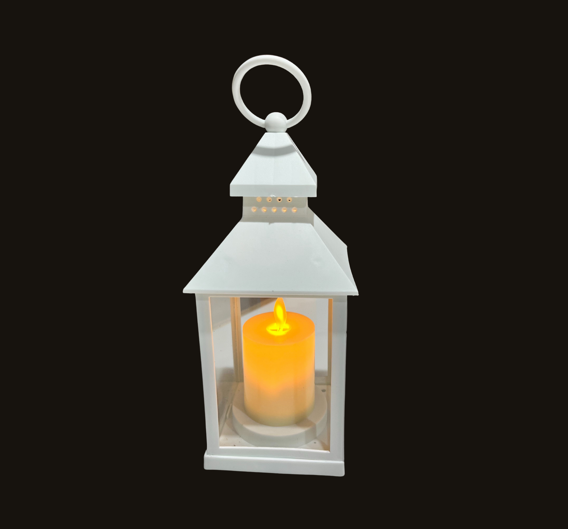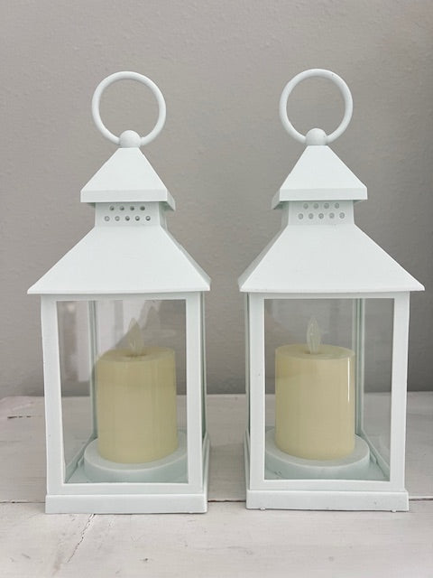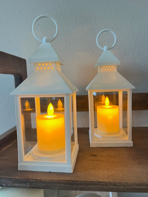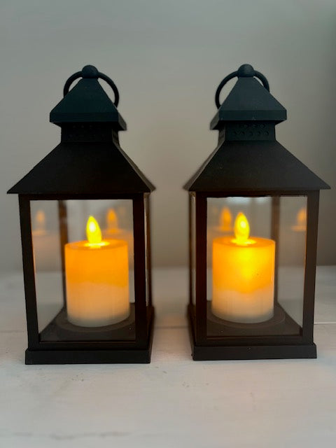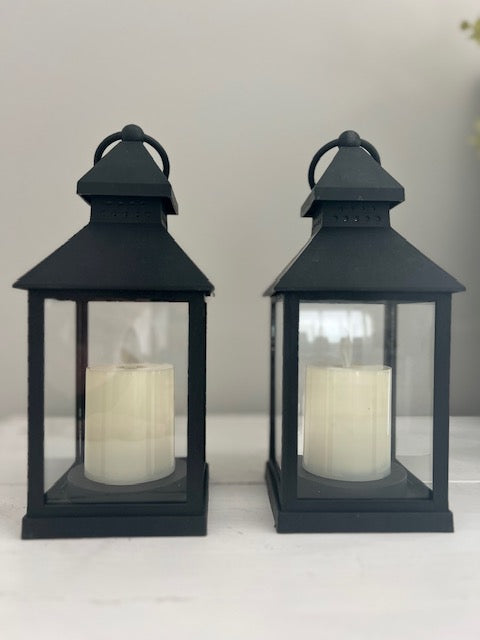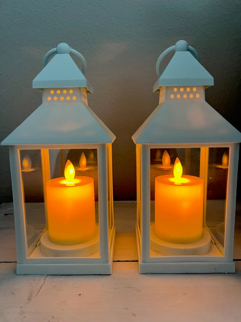 Create beautiful decor around your home with your choice of a single or a set of 2 lanterns with a flickering flame effect in either black or white finish. Made of heavy duty plastic, these indoor lanterns use 3 AAA batteries per lantern (not included) for the illusion of beautiful candle flames. Great for ambience, tablescapes, covered outdoor lighting, around planters, decor on shelving and mantels and so much more!