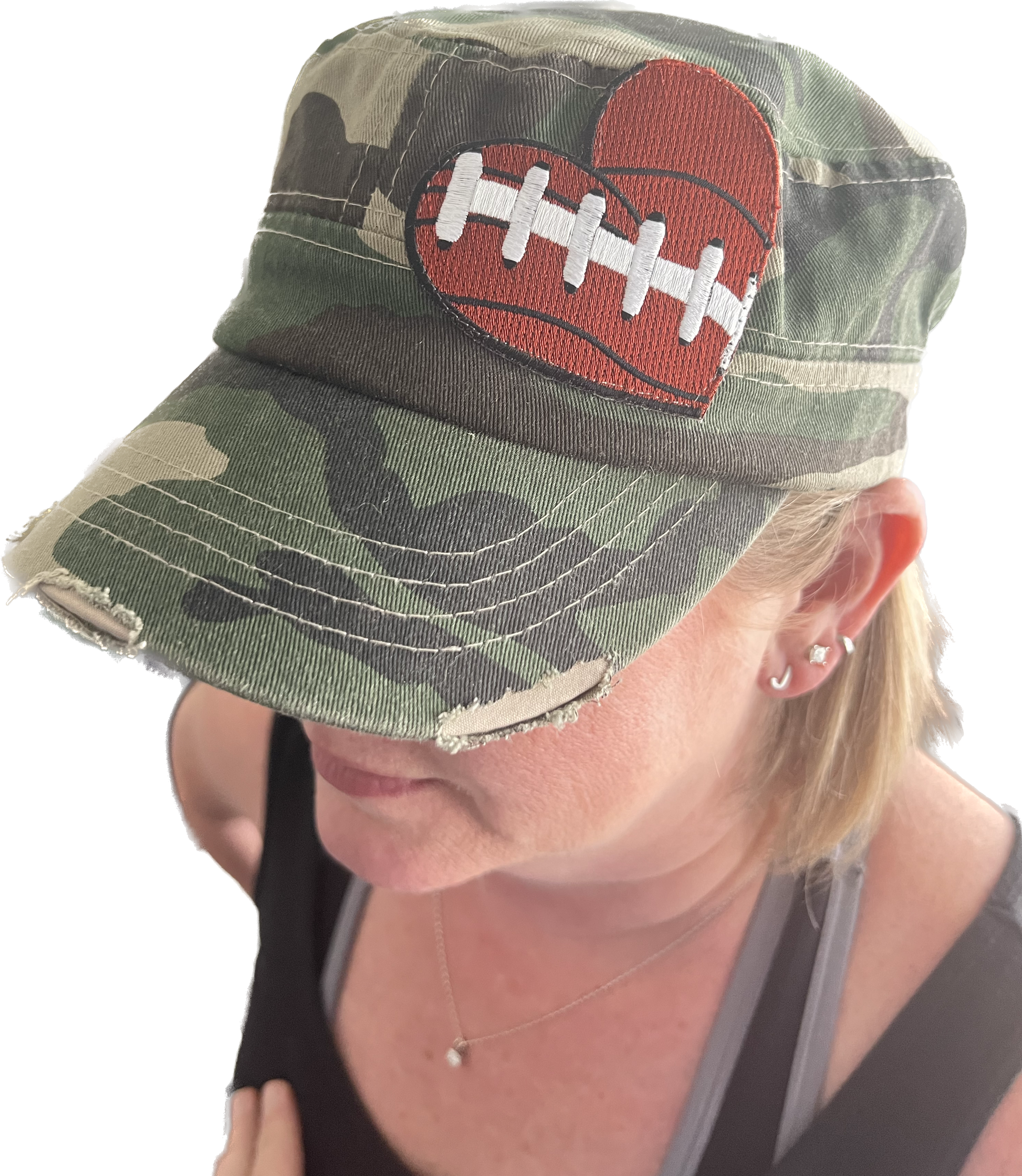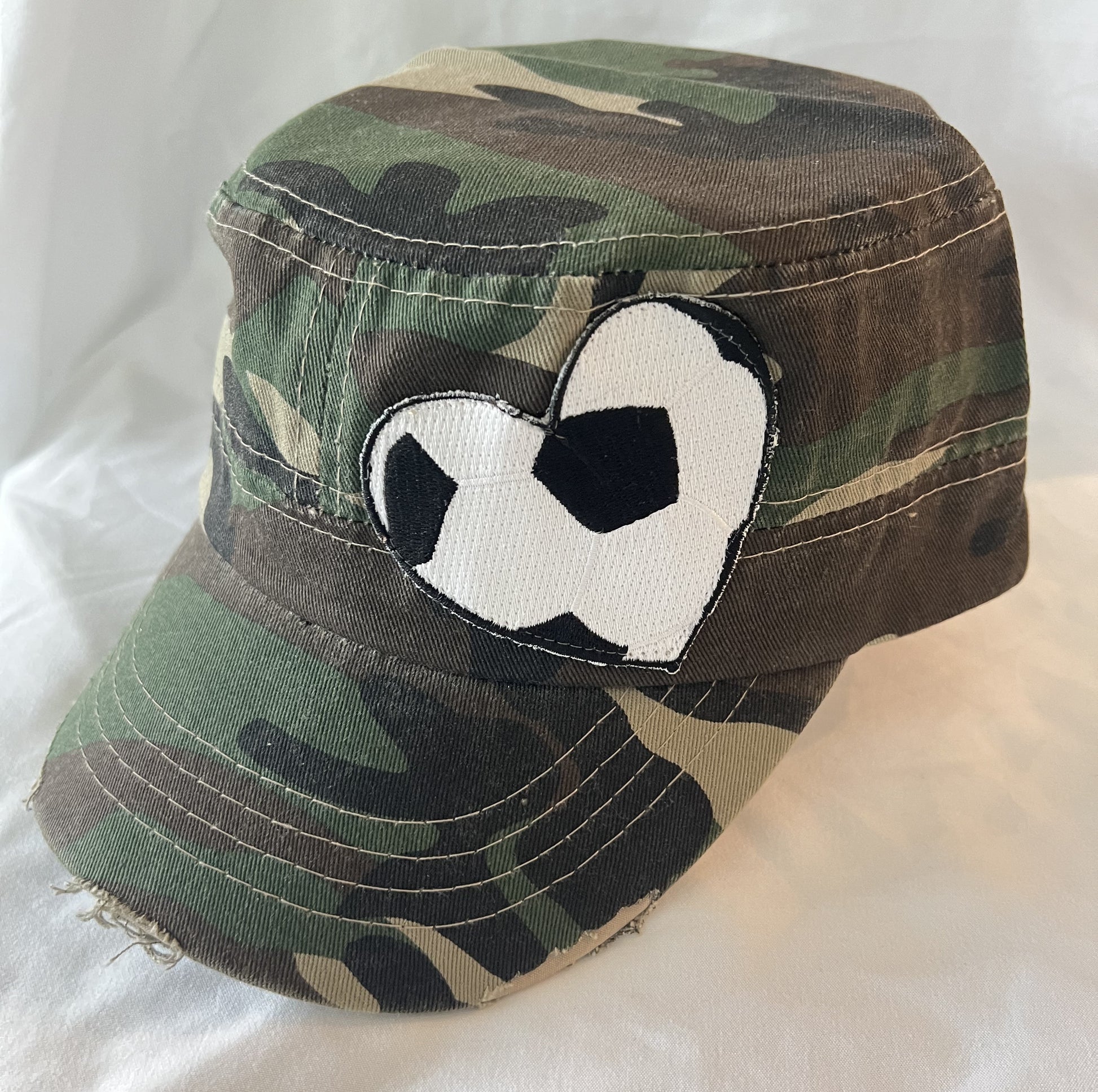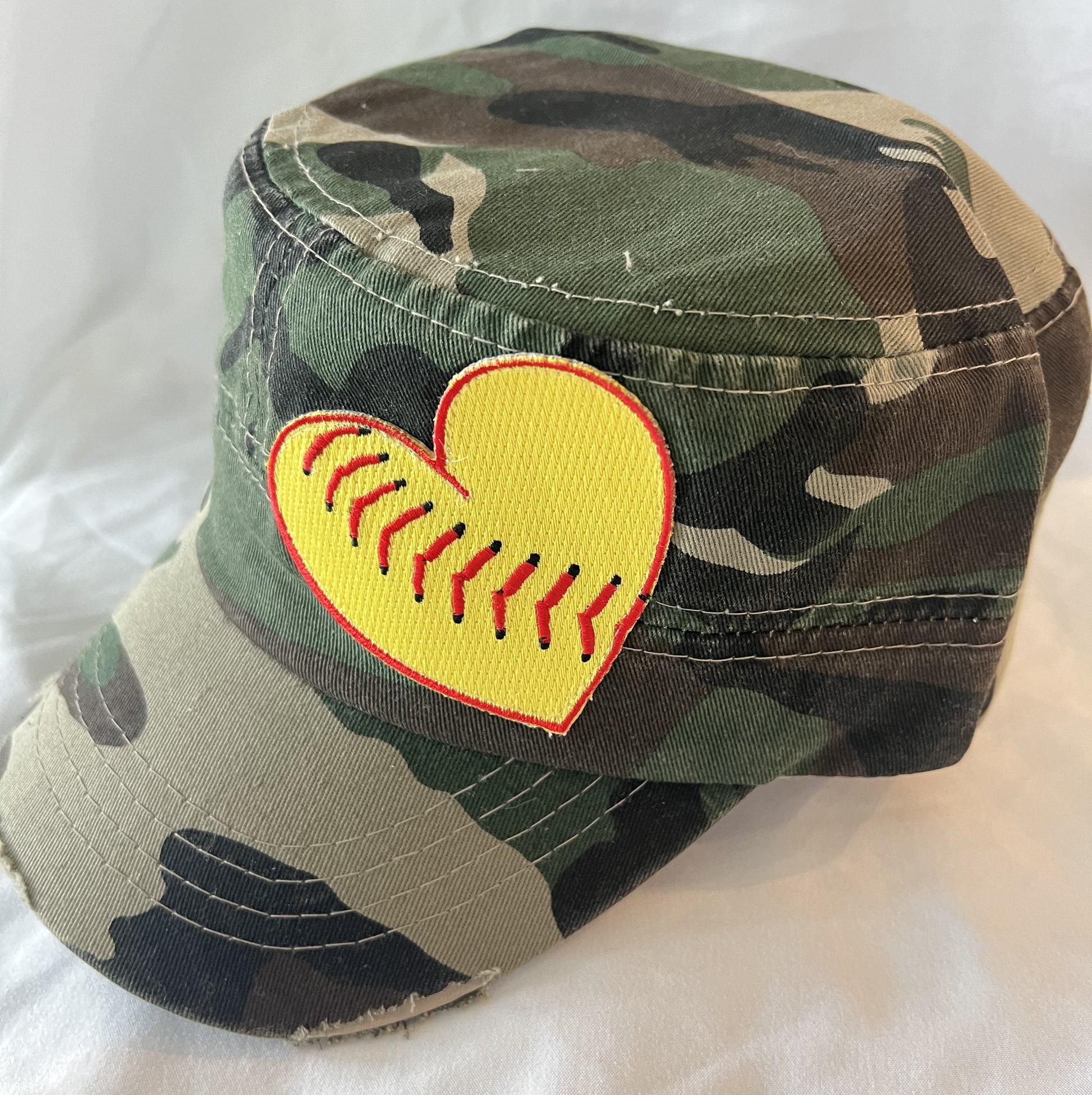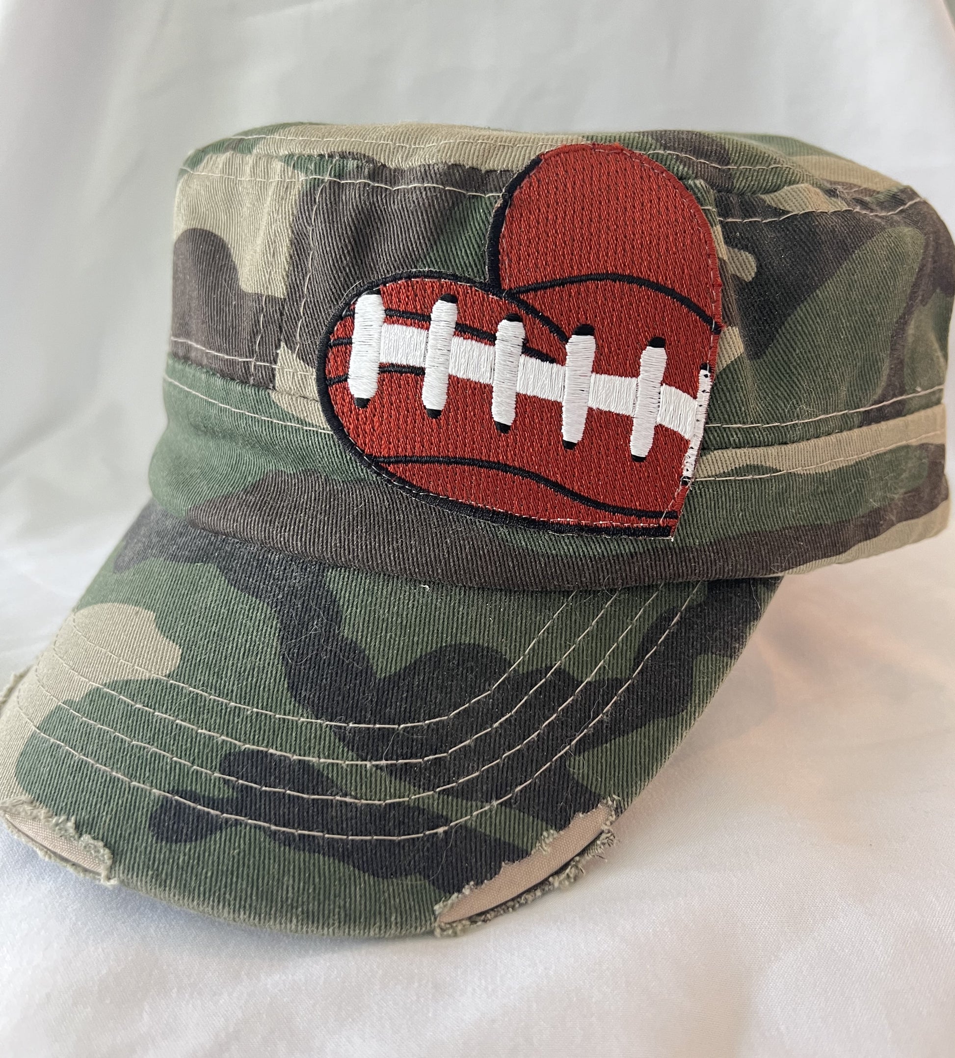 Super cute vintage distressed camo hat with your choice of heart: baseball, football, softball, soccer or basketball. The hats match back to the SportSeams ladies tees and bags. Get all 3 for your next sporting events!